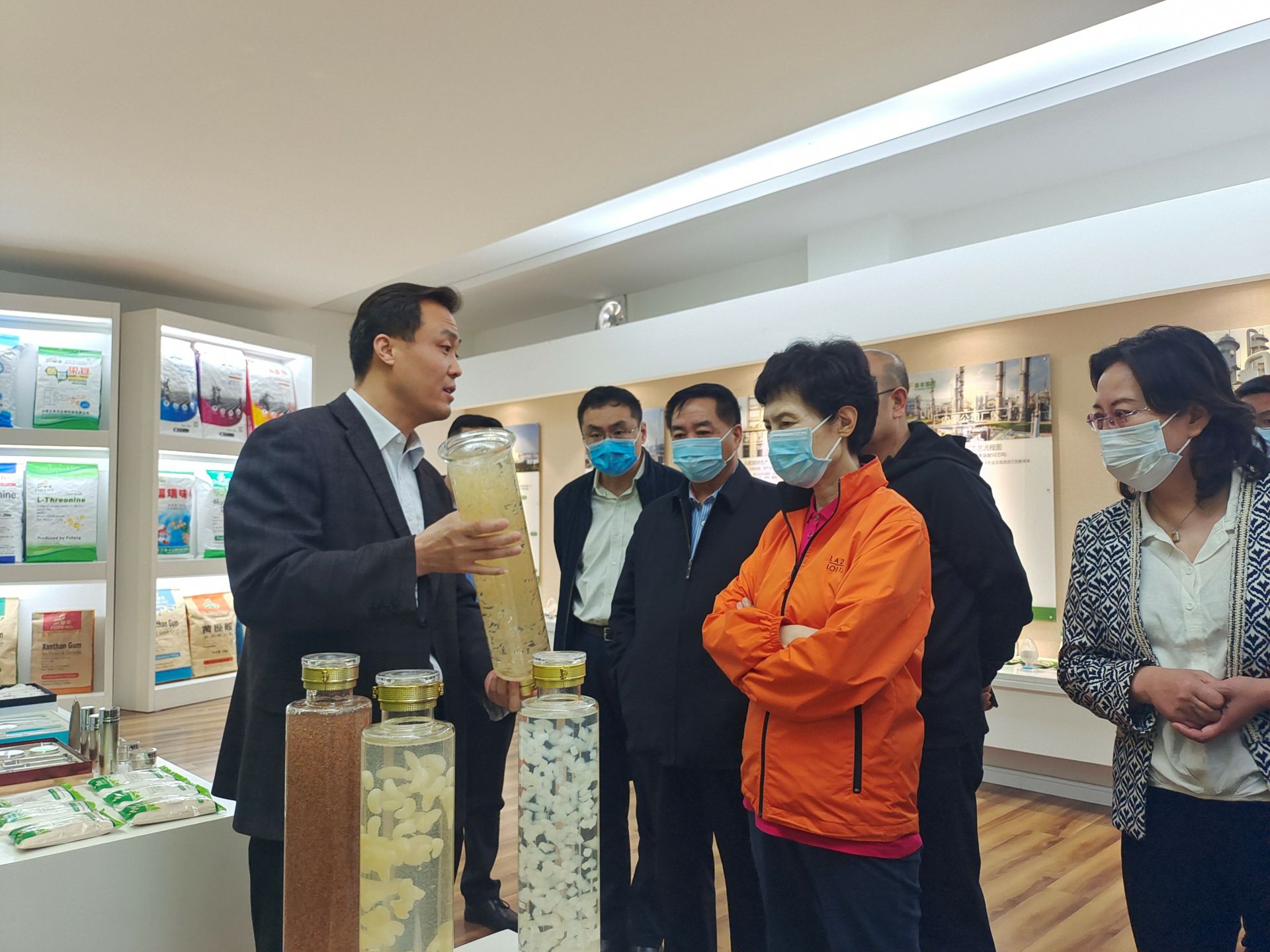 在公司展厅 , 高会长一行人认真听取了李总对于内蒙石家庄祁文绿色循环经济有限公司公司的生产、经营情况以及国际贸易现状的介绍,了解了企业在开展对外贸易中存在的困难和问题。